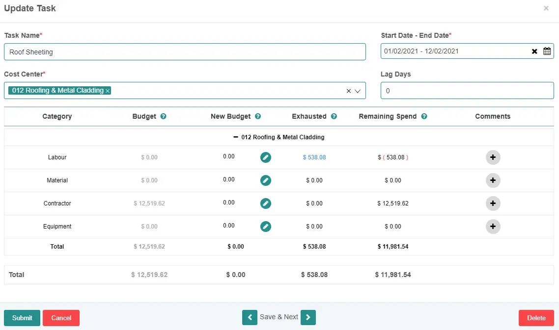 Why do we use the Gantt chart as our cost tracking tool? The reason is that builders think about daily tasks including instructions for staff, material orders, contractor and supplier coordination. Generally, thinking about task budgets when lead times come due is no different from thinking about what the budget is before commencing, as well as checking during the task. It provides the ability to make the right decision faster.